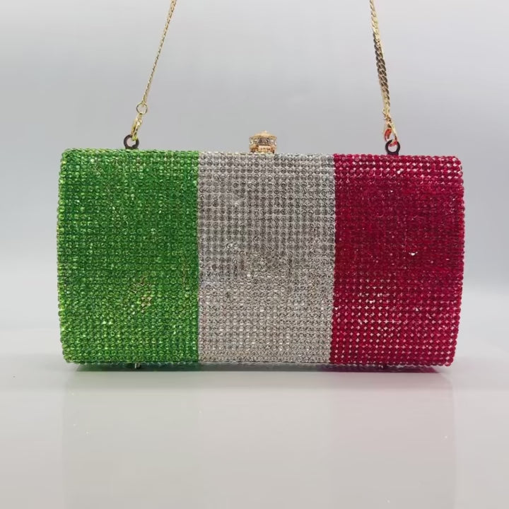 A Clutch Cristal Preziosa Italian celebra a elegância e a tradição da Itália, com cores inspiradas na bandeira italiana. Feita à mão pelo renomado estilista Fausto Puglisi, em cristais e metal, esta peça única carrega a história e a essência em cada detalhe.