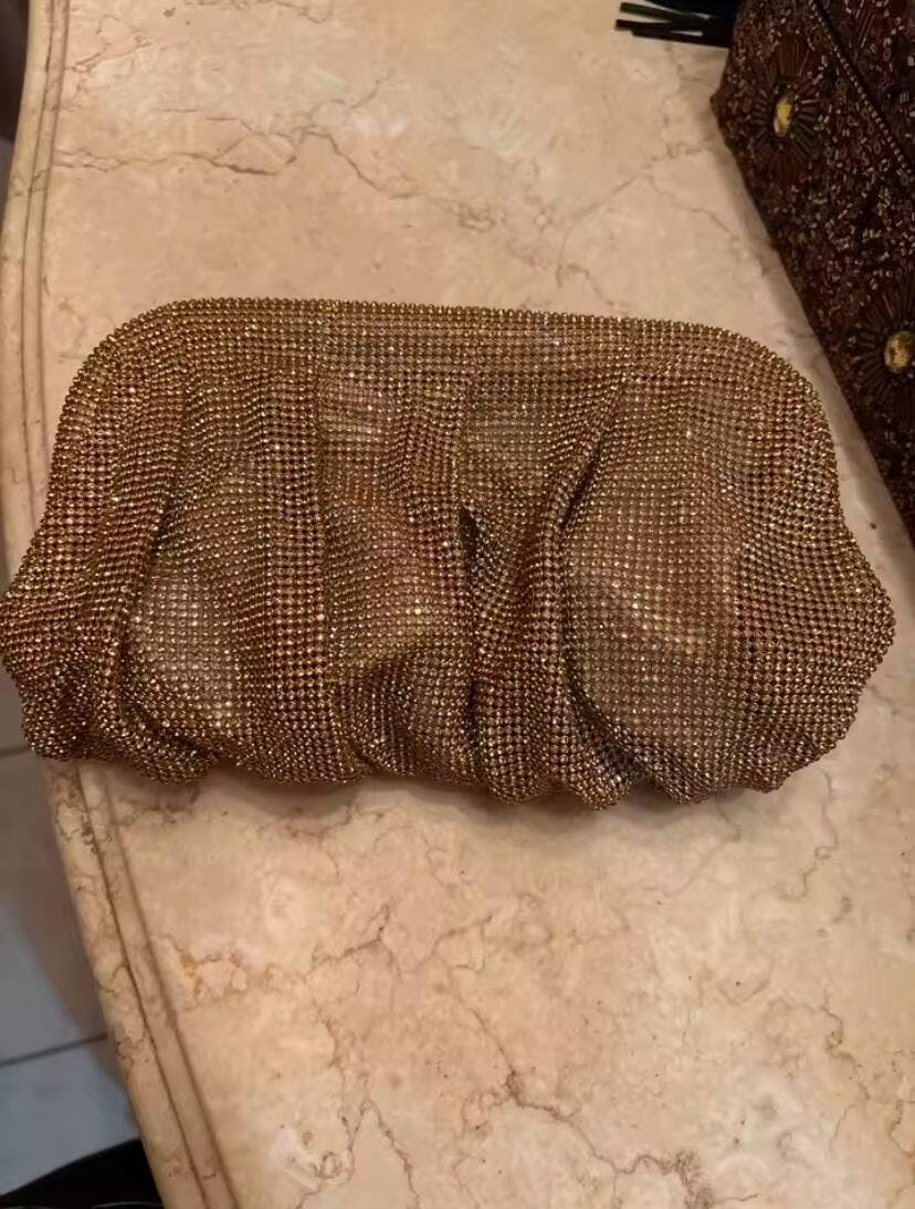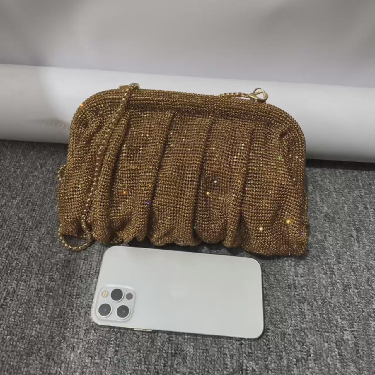 Feita para uma silhueta relaxada com um design de drapeado franzido, esta bolsa marcante foi salpicada com strass deslumbrantes. Clipes elegantes abrem para revelar um compartimento central e acessórios discretos para a alça de ombro removível de corrente prateada. Uma bolsa versátil e luxuosa que pode ser segurada na mão ou usada no ombro.